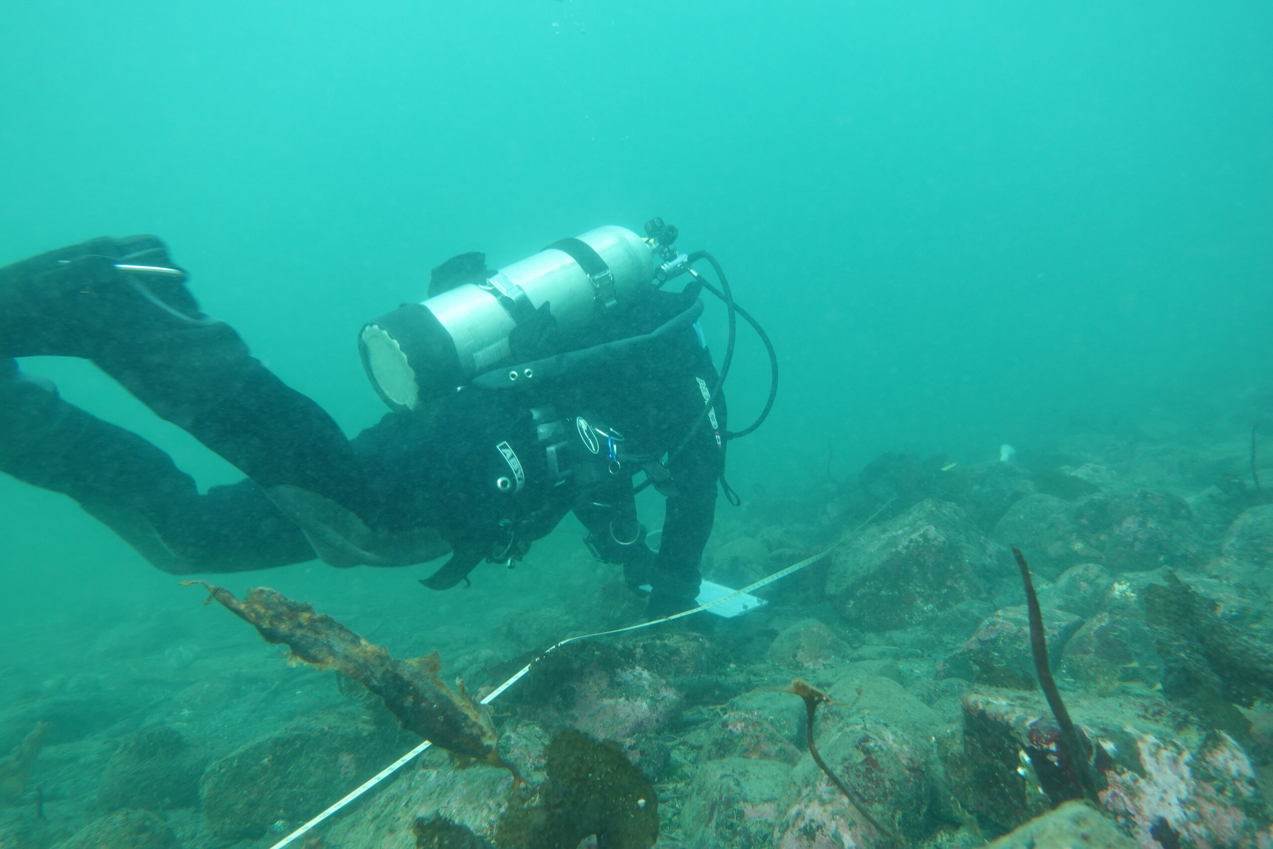 “Then in the field you practice your skills underwater. You learn how to handle your equipment while carrying other gear like notepads, measuring equipment and so on,” explains Caelan. “There are safety skills you have to practice, like swimming with an unconscious dive partner, learning how to use lift bags to carry specimens or debris to the surface, and tying knots underwater. In the final exam,” he adds, “your mask is blacked out, and you have to demonstrate that you can tie knots even in zero visibility.”