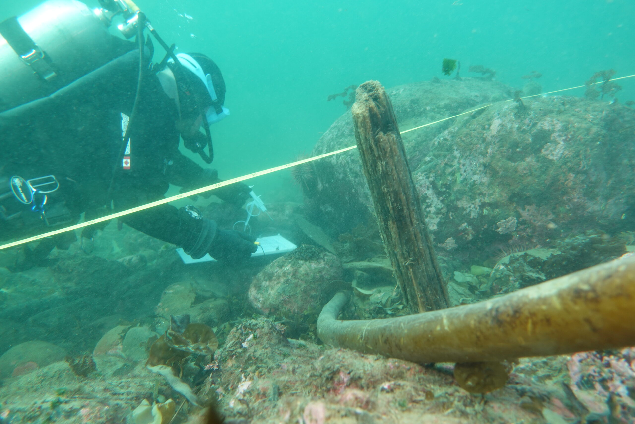 The Guardians are putting their dive certification to good use in other applications as well as the kelp research, such as salvage operations and archaeological surveys. In the K’ómoks estuary, for example, Caelan has been supporting work in the Kus-Kus-Sum Project, a joint initiative with K’ómoks First Nation, the city of Courtenay and Project Watershed aimed at converting a former industrial sawmill site into a healthy, naturalized tidal marsh and riparian estuarine ecosystem. “We’re diving to check sites where a barge is being brought in to remove a wall, to make sure there are no fish traps that the barge might damage.”