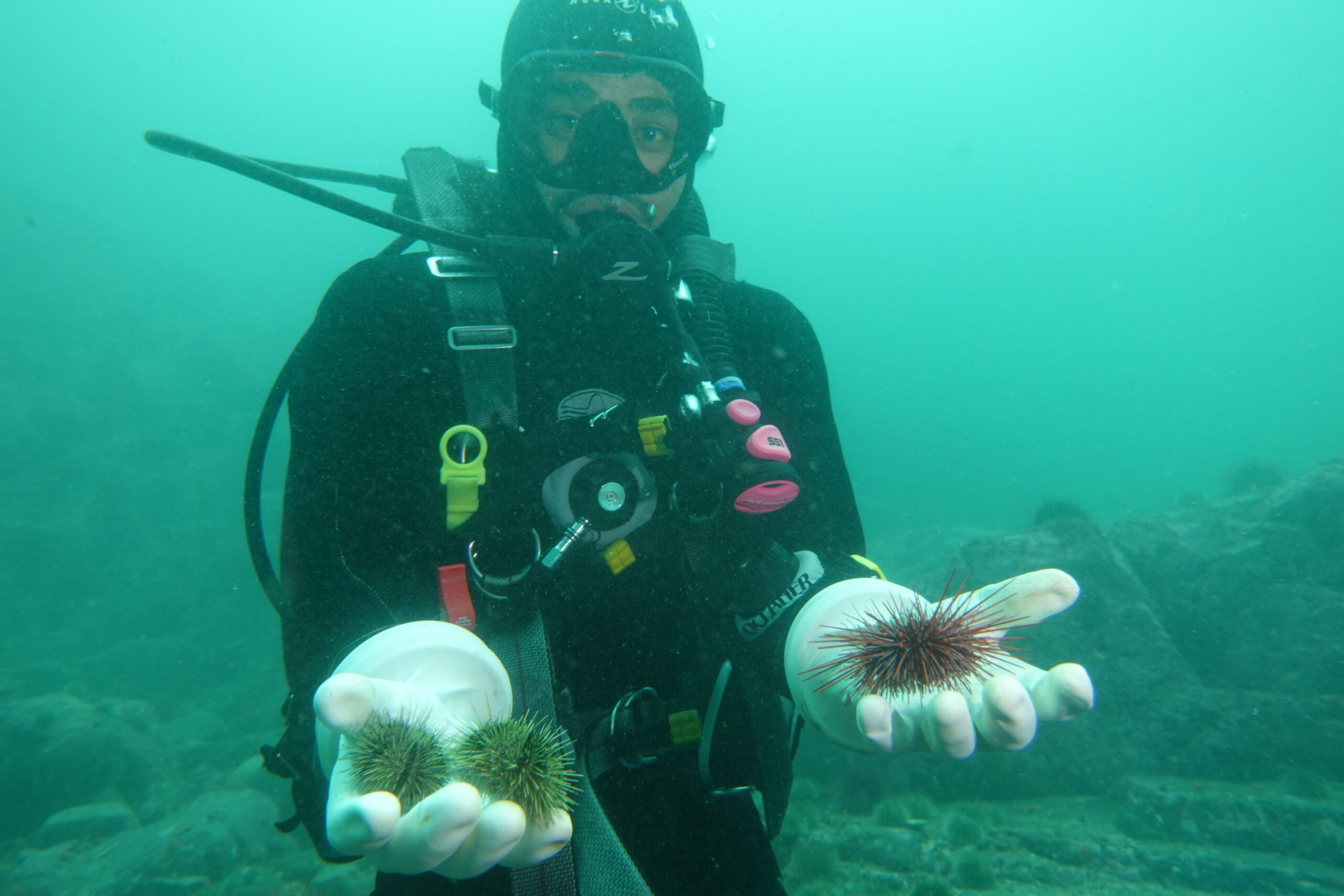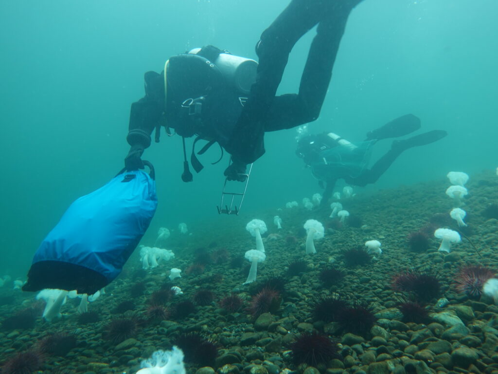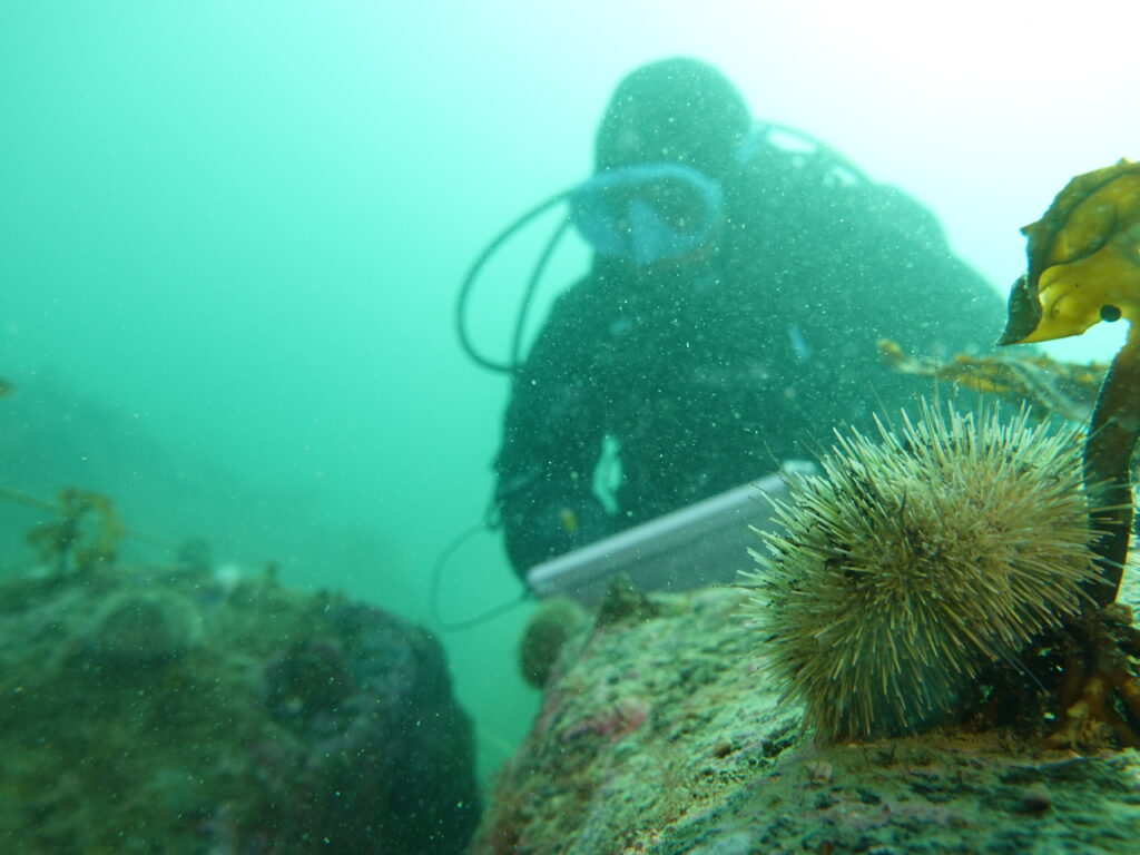 The training is far from easy, says Markus. “There’s a lot of information they are required to learn, such how to identify species—which is one thing to do out of a book and another thing entirely underwater; species are often camouflaged or colored or textured differently than you might see in a book. Guardians also need to know how to properly set up a transect underwater and how to effectively quantify the number of species that they’re identifying, including kelp, invertebrates, fish, of course, urchins, and sunflower stars. It takes time to build those skills.”